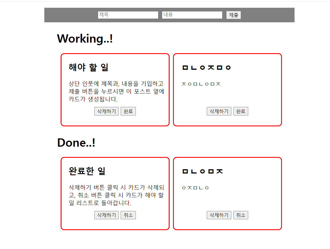 <ToDoItem title="해야 할 일" content="상단 인풋에 제목과, 내용을 기입하고 제출 버튼을 누르시면 이 포스트 옆에 카드가 생성됩니다." />