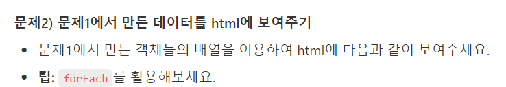 문제1 에서 만든 users 의 데이터를 forEach 메소드로 순회시켜 ${user.} 를 이용해 데이터를 넣어줌