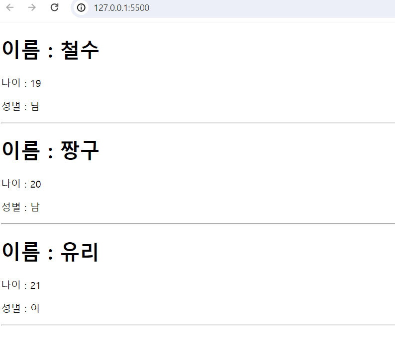 데이터가 들어갈 자리인 name, age, gender 클래스에는 querySelectorAll 로 변수 지정 (여러개)