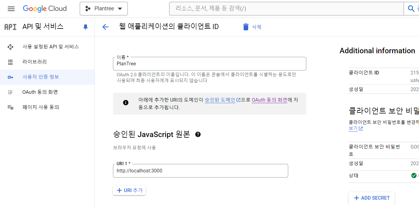 - 사용자 인증 정보 > 사용자 인증 정보 만들기 > OAuth 클라이언트 ID를 선택