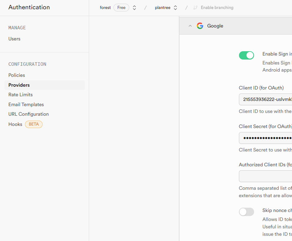 - 생성된 클라이언트 ID와 클라이언트 비밀을 복사하여 Supabase 대시보드의 Google 제공자 설정에 입력