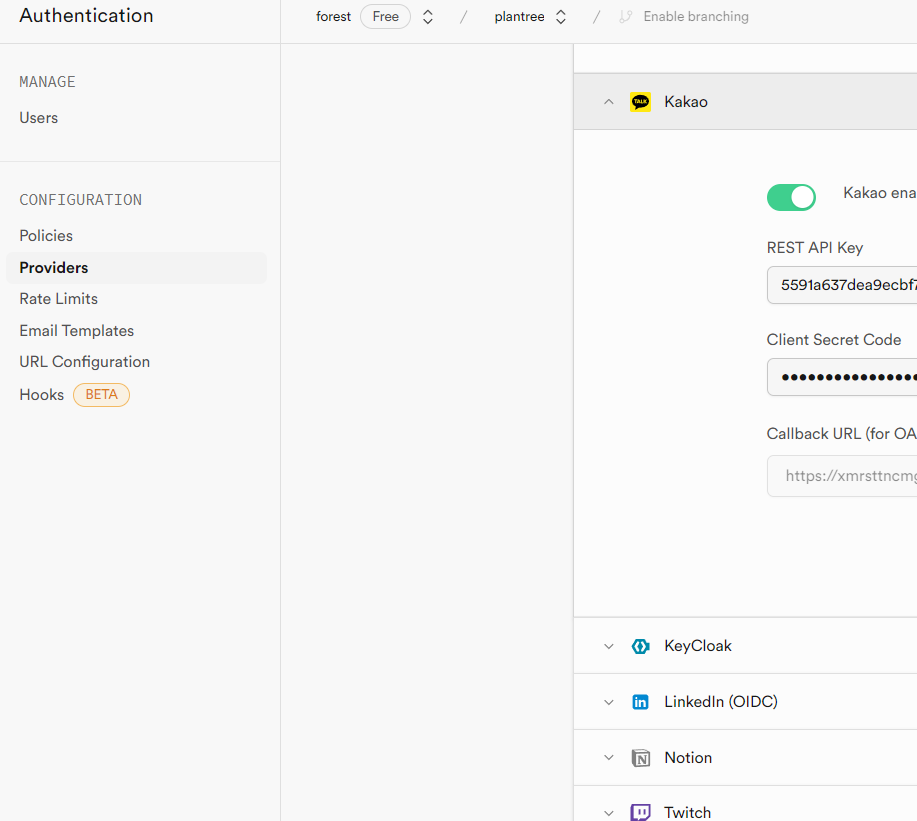 - REST API 키를 복사하여 Supabase 대시보드의 Kakao 제공자 설정에 입력합니다.